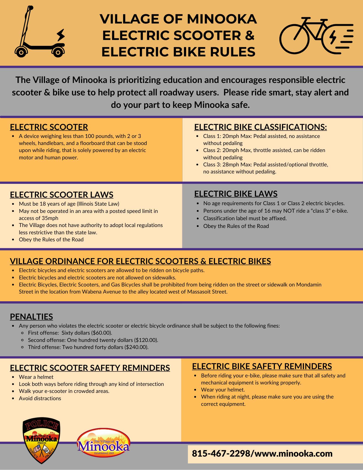 Illinois has implemented a three-class electric assist bicycle system (e-bikes). All e-bikes operating in Illinois must comply with equipment and manufacturing requirements adopted by the U.S. Consumer Products Safety Commission. You may operate an e-bike on any highway, street, or roadway authorized for use by bicycles including, but not limited to, bicycle lanes. You may operate an e-bike upon any bicycle path unless the municipality, county, or local authority with jurisdiction prohibits using e-bikes or a specific class of e-bike on the path. You may not operate an e-bike on sidewalks. The three classes of e-bikes in Illinois are as follows:
